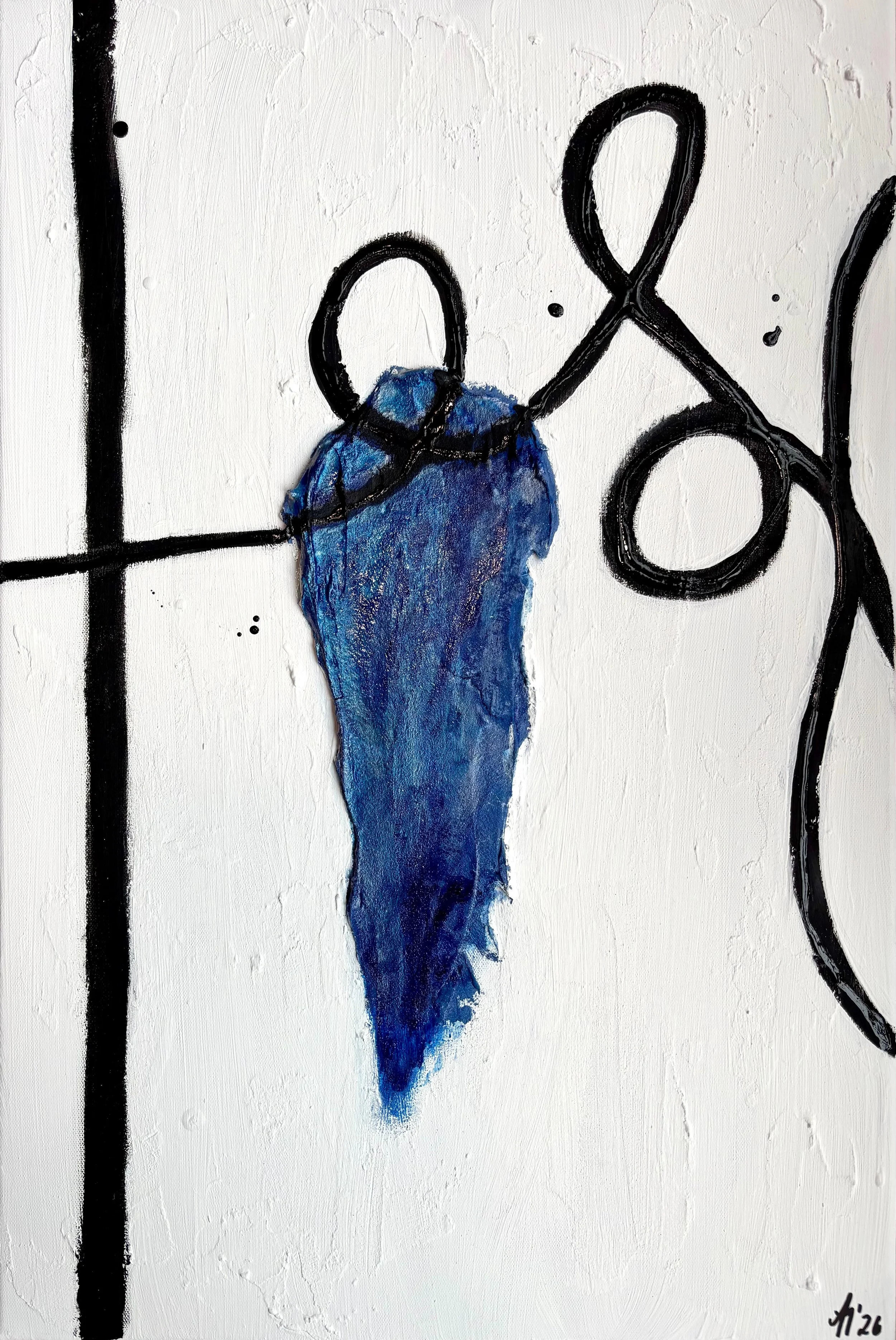Despite this intervention, the figure still retains a degree of compositional authority. The blue form remains central and perceptually dominant, yet its equilibrium has been disturbed. The work therefore captures a transitional state in which autonomy persists but is no longer fully secure.